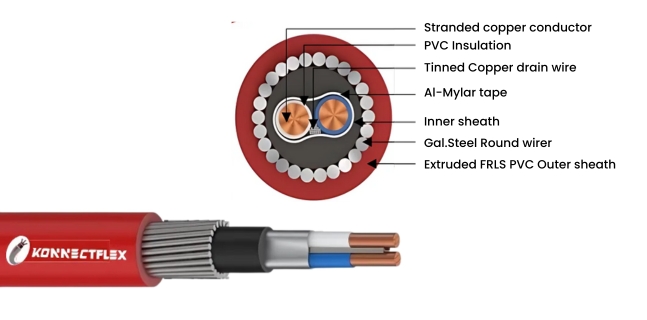 - Inner Sheath: In-house developed thermoplastic compound having low emission of smoke and corrosive gases when exposed to fire and also ensures circular shape of cable.