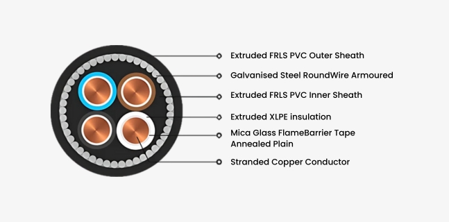 - Insulated Cores assembled together. | - Extruded FRLS PVC Inner Sheath. | - Galvanised Steel Round Wire Armoured. (also available with Galvanised Steel Flat Strip Armour, dimensions and weights changes accordingly)
